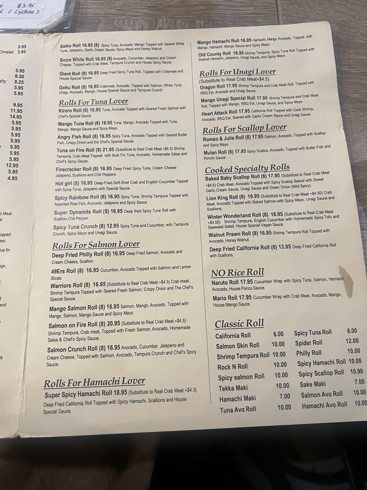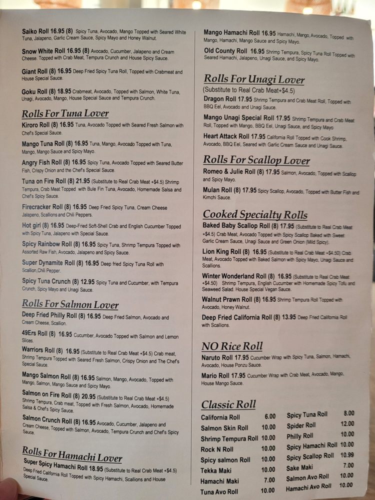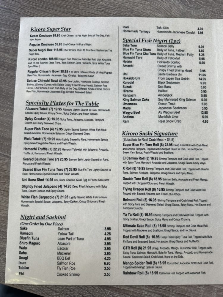 Kiroro Sushi, located in Belmont, CA, offers a unique menu catering to both vegetarian/vegan sushi lovers and regular sushi enthusiasts. With a wide range of options like cucumber avocado crunch, spicy veggie roll, and mango crunch special roll, this sushi bar stands out for its flavorful and creative dishes. Customers praise the quality of the fish, particularly the salmon nigiri, and enjoy the attentive service and complimentary green tea. While some dishes like the mushroom tempura roll may be hit or miss, the overall experience at Kiroro is solid. With options for outdoor seating, drive-thru, and even catering, Kiroro Sushi provides a diverse and satisfying dining experience for sushi aficionados.